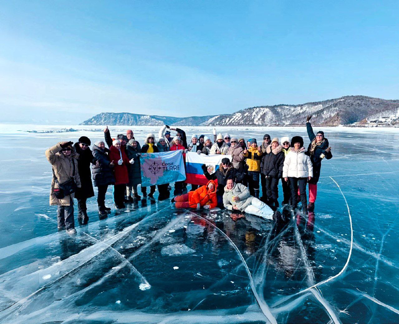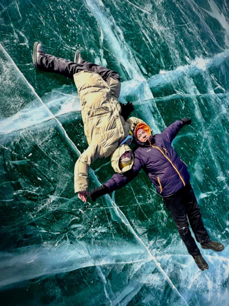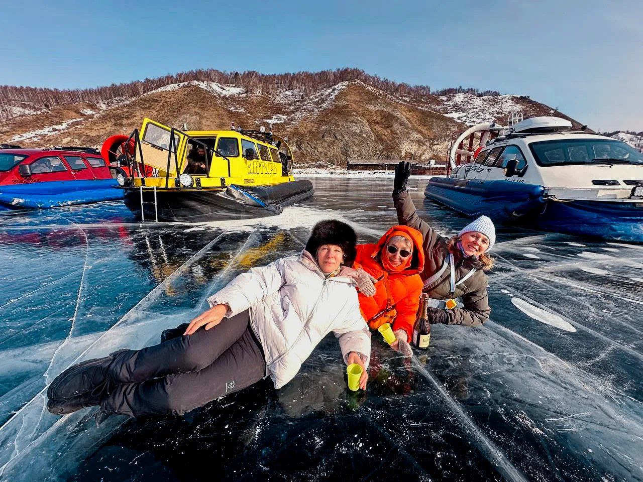 С пика мы спустились на скользкое прозрачное покрытие Байкала.