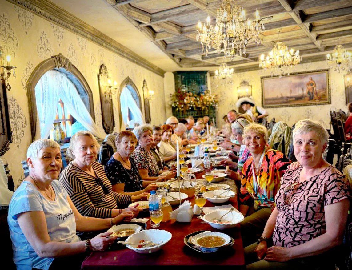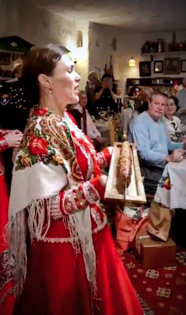 Мы собрались в "Курене казака" по особому случаю - наши уважаемые руководители Валентин и Марина Эйхман праздновали годовщину свадьбы и пригласили всю группу на это торжество - что для нас было сюрпризом. Мы отмечали этот годовой этап брака в очень теплом, искреннем откружении. Застолье было широким с обильной и вкусной едой, напитками и сопровождалось казачьими песнями и танцами. Такой полный восторг, всё было душевно! Нам подали необычное блюдо "Шашка атамана" - мясо наматывают на казачью шашку и готовят на углях.