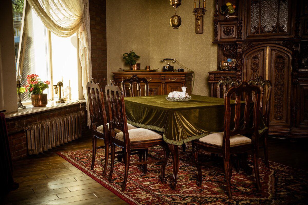 Очень много антикварных деталей в интерьере: буфет конца XIX века, привезённый из Европы, свечная люстра, шкафы, зеркала, некоторые столы и стулья.
