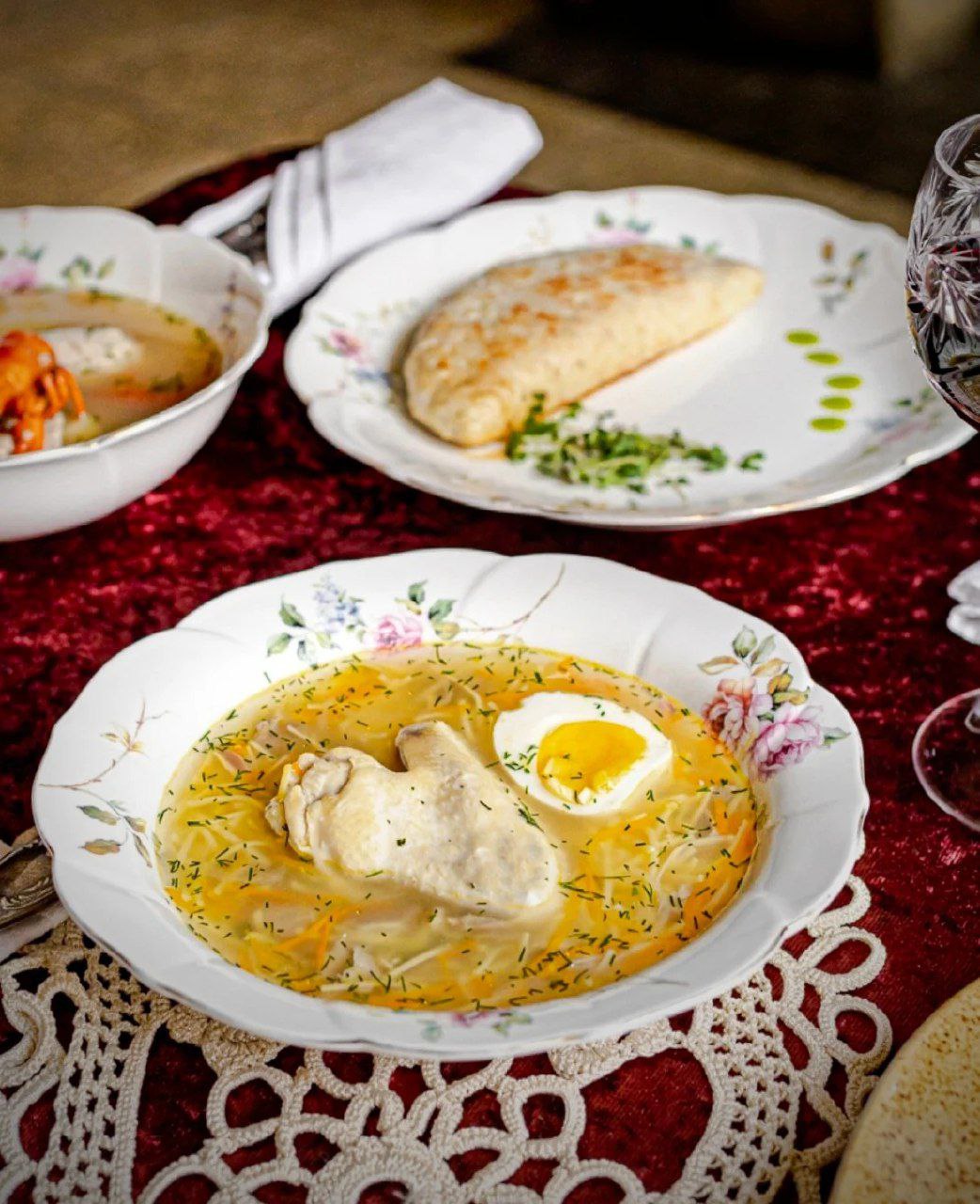 Супъ: «уха курячья шафранная» съ пшеномъ сарацынскимъТельное из сулы. Белое сочное мясо судака обжаренное со шпинатом, с добавлением вина, сливок и сливочного сыра внутри котлеты из перемолотого судачьего филеПельмени изъ подкопченной утки Подаются на Вашъ выборъ: въ крьпкомъ куриномъ бульонѣ или безъ онаго, но тогда непременно съ масломъКушать подано. Наш выбор оправдал ожидания, пельмени отменные