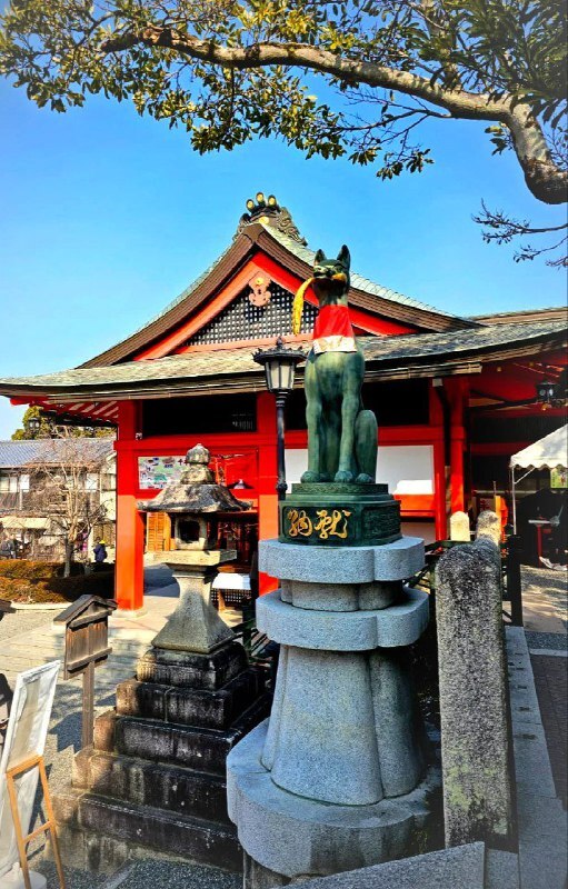 У ворот храма стоят статуи лис кицунэ, защищающие храм от злых духов. Ведь лисы раньше спасали драгоценные запасы риса от мышей. А так как храм посвящен божеству риса и изобилия, то именно лисы и охраняют это синтоистское святилище.