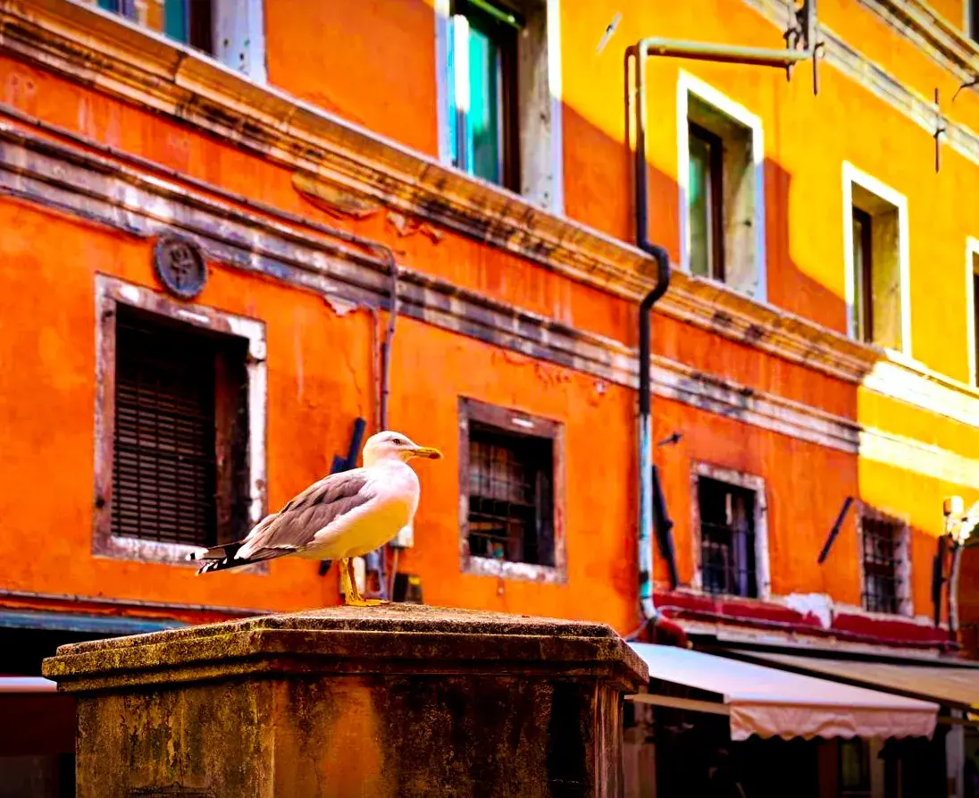 И тут начинается настоящее представление: местные чайки, настоящие хулиганы лагуны, устраивают воздушные пиратские рейды. Выследив добычу, они с пронзительными криками пикируют на столики, пытаясь стащить заветное канапе, а потом с победным видом уносят добычу на карниз палаццо, оставляя после себя лишь след белых перьев на брусчатке.