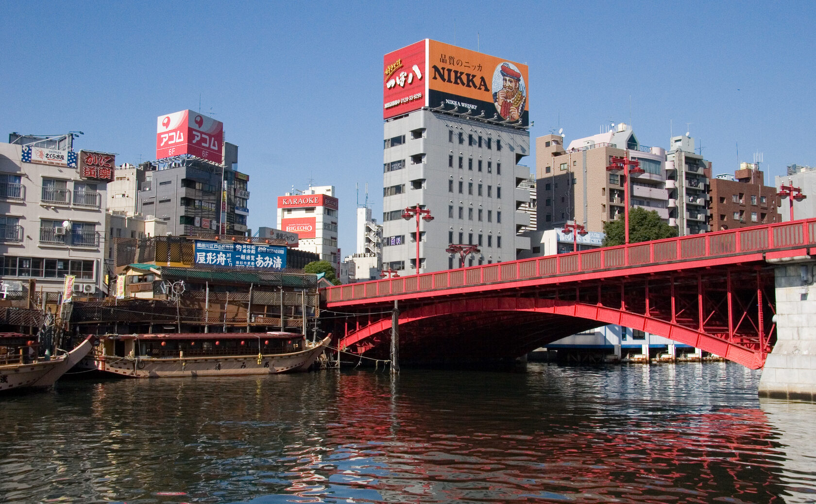 Канал Дотонбори - чёрное зеркало, в котором тонут избыточные краски дня, чтобы ночью воскреснуть в удвоенном сиянии. В его неподвижной воде горят опрокинутые миры: перевёрнутый краб плывёт в глубине, а золотые буквы рекламы складываются в загадочные послания.