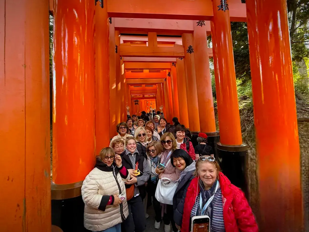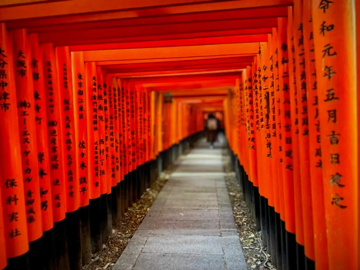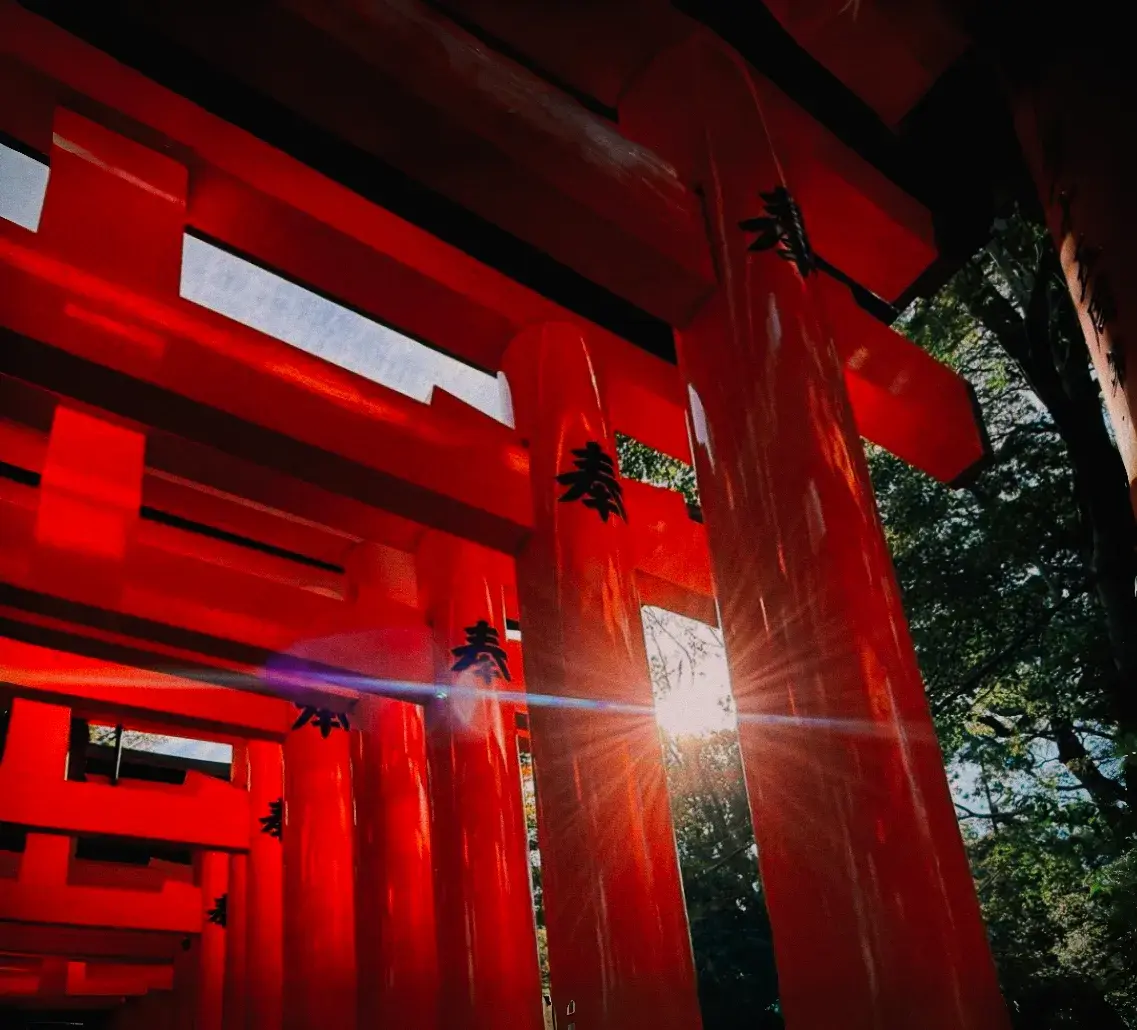 Мы у подножия горы Инари. Воздух здесь густой от запаха древнего кедра и камня, намокшего от времени. Это Киото не парадный, а сокровенный. Тысячи торий: алые, как заря, они уходят ввысь, сплетаясь в пульсирующий тоннель.