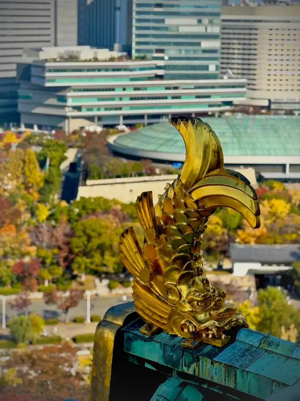 Золотые дельфины-сятихоко на крыше, сияющие как вызов, - те же, что видели пожары войн, теперь отражаются в стекле офисных башен.