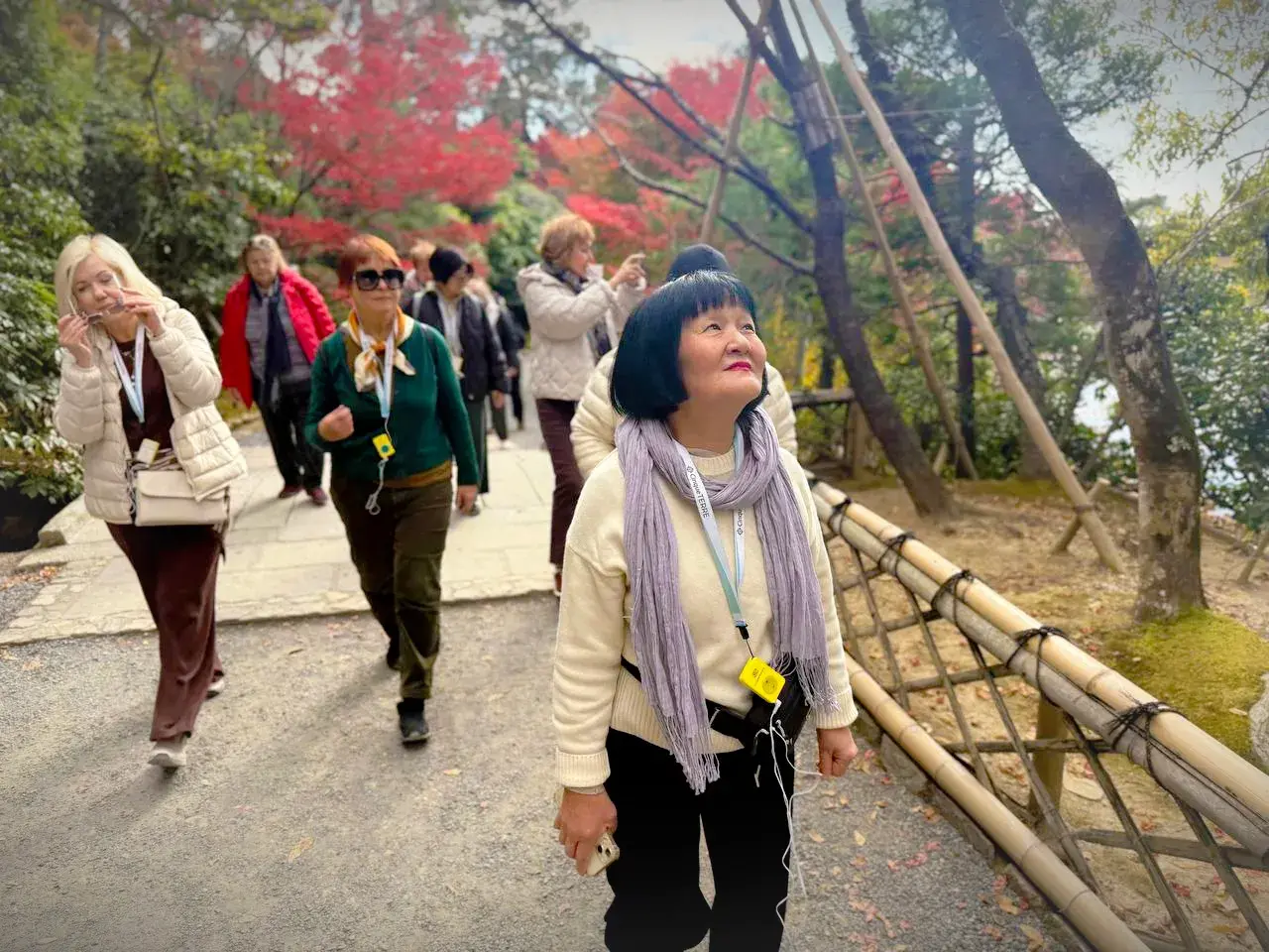 А в бамбуковой роще Арасияма царил иной мир: стебли, словно струны кото, пели на ветру, пропуская сквозь себя лучи солнца, которые падали на землю уже окрашенными в тёплый янтарь. Под ногами шелестел "гари-гари" ковёр из листьев - такая вот музыка японской осени.