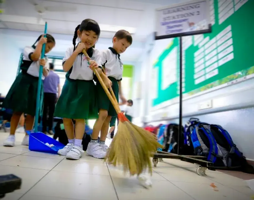 Классы и учителя меняют каждый год - для социализации. Раз в год учитель приходит домой, смотрит на условия, беседует с семьёй. Директора не боятся - подходят запросто. В школе нет уборщиц: дети с первого класса моют свои классы, стены, парты, раздают еду в столовой (вам это ничего не напоминает?). Экономят всё: тетрадь нужно исписать до конца, форму носят годами, подшивая и укорачивая. О брендах и не думают - скромность и "Юникло" в почёте.