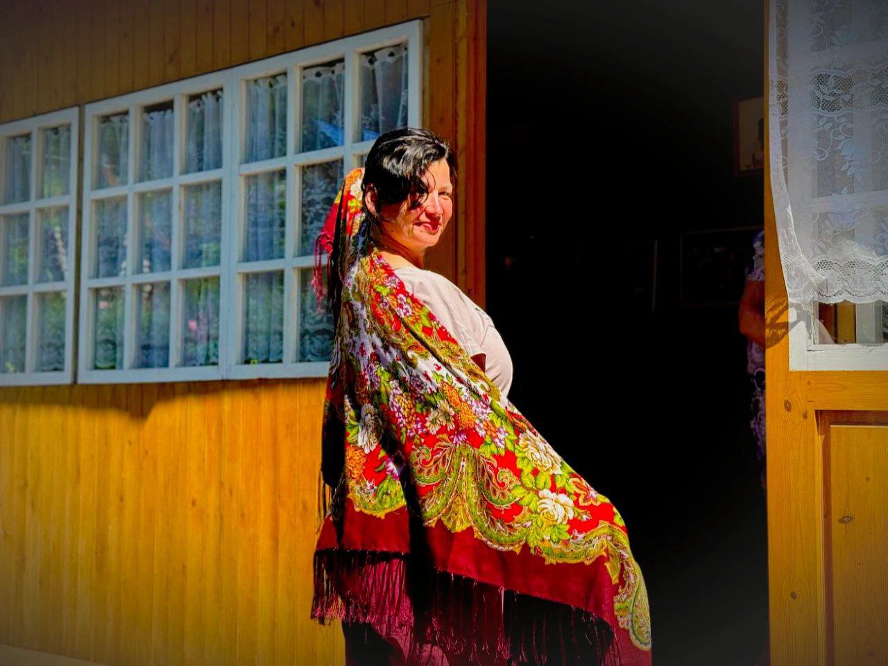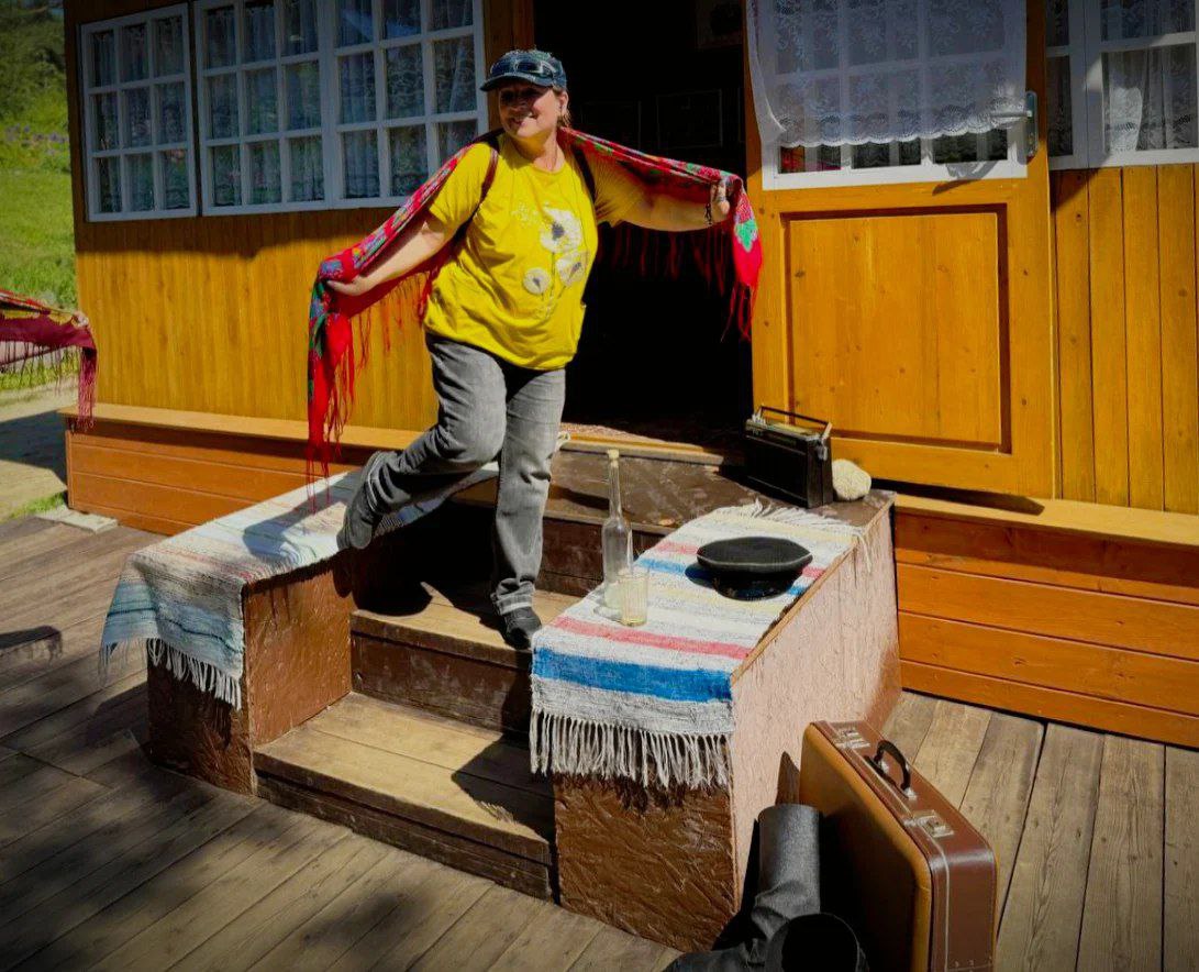 Мы смогли пофотографироваться в сапогах и картузе дяди Мити, примерить шаль Надежды и даже попробовать разыграть сцену прямо на деревянных подмостках.