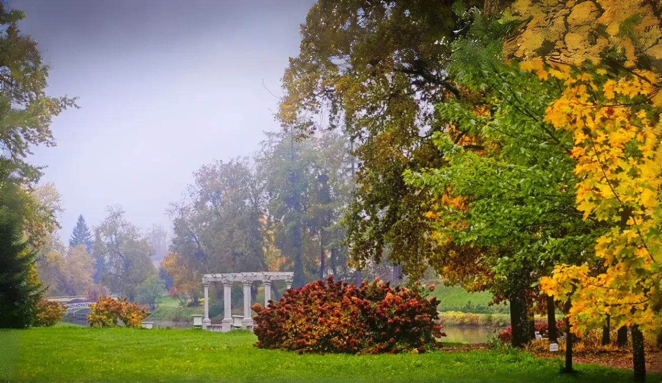 Сквозь позолоту опадающих деревьев проглядывает строгий лик усадьбы. Здесь время плывёт иначе - размерено, как вода в прудах.