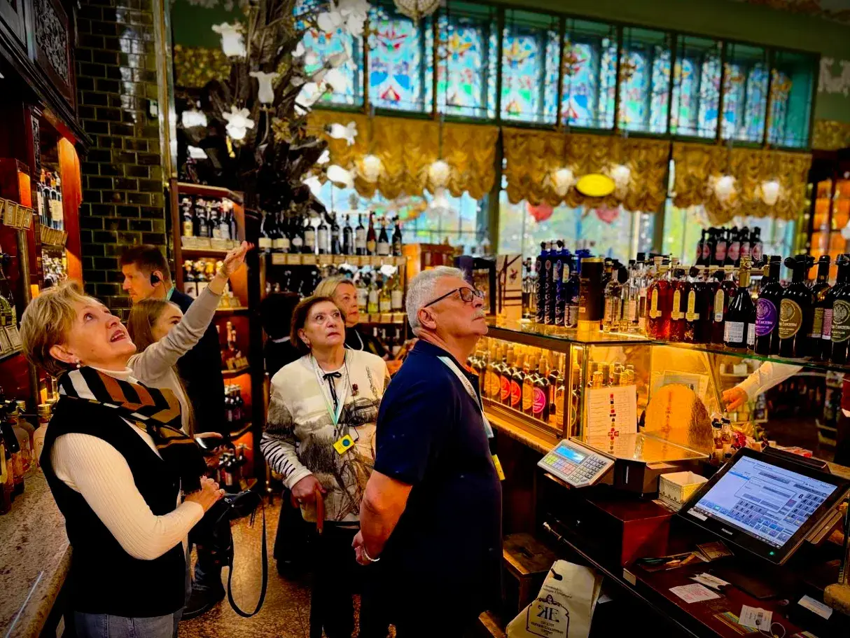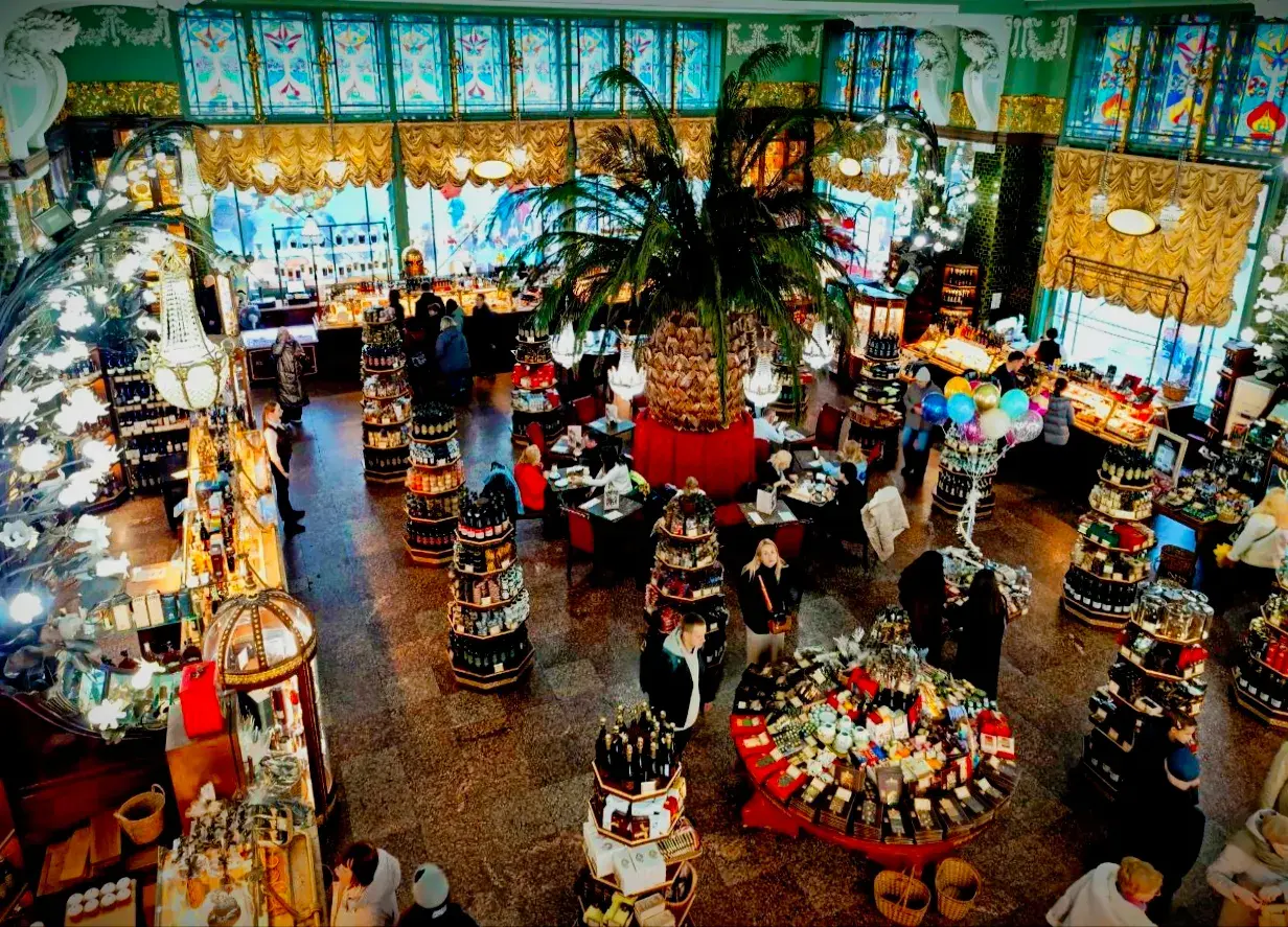 Переступив порог Елисеевского гастронома, я будто совершила путешествие во времени. Под высоким стеклянным куполом замерли в элегантном поклоне стройные пальмы-нефы, их листья купаются в золотистом свете хрустальных люстр.