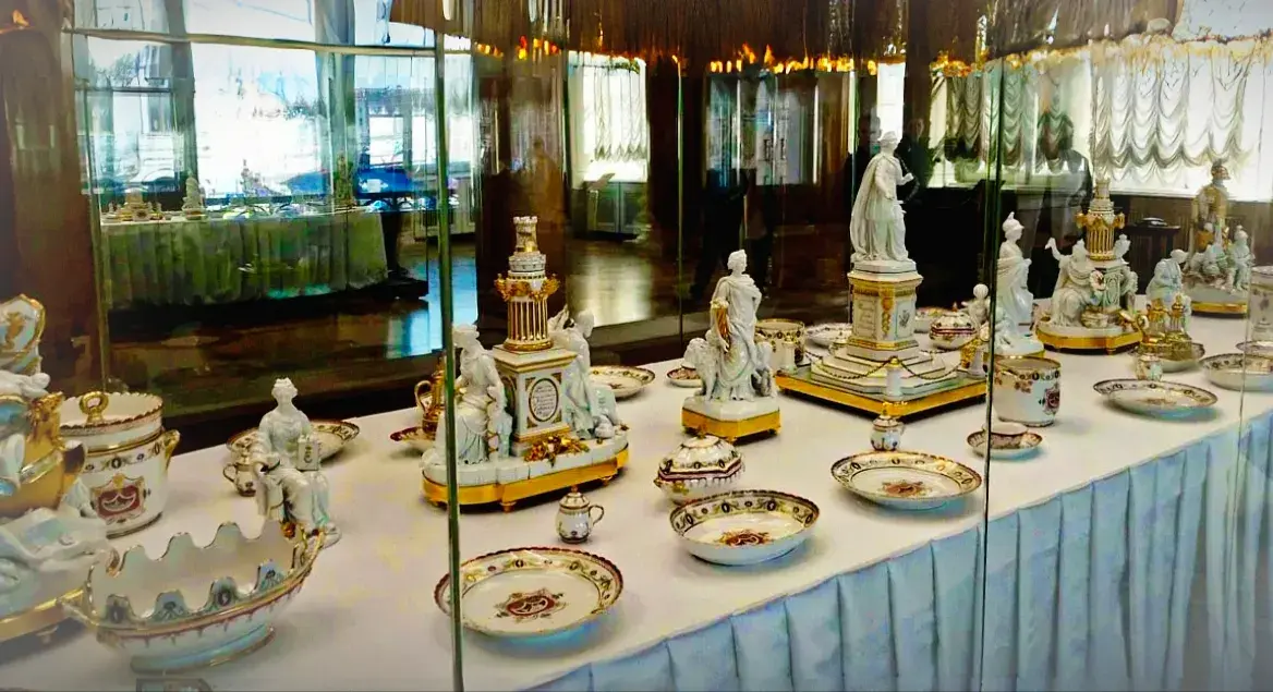 В Парадной столовой дворца сейчас демонстрируется выставка "Русские императорские сервизы".