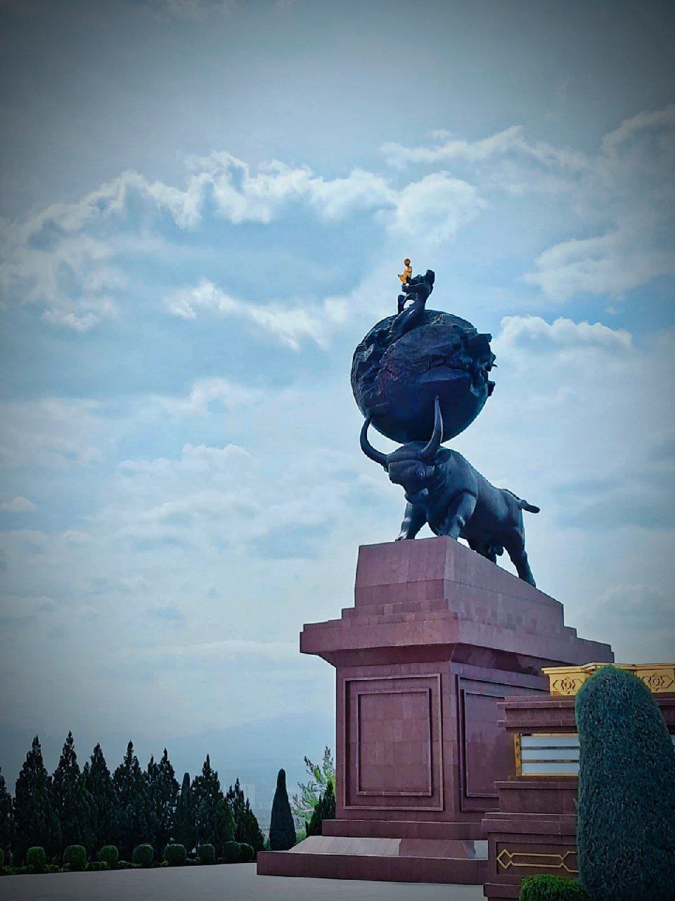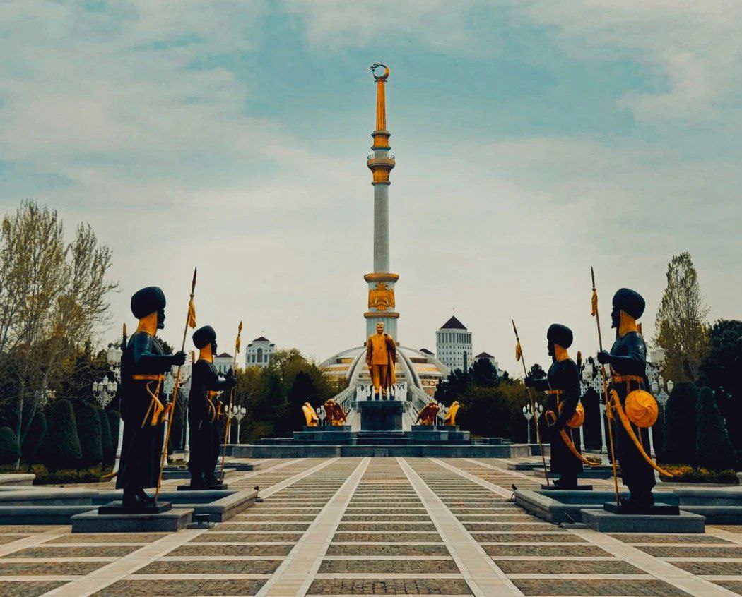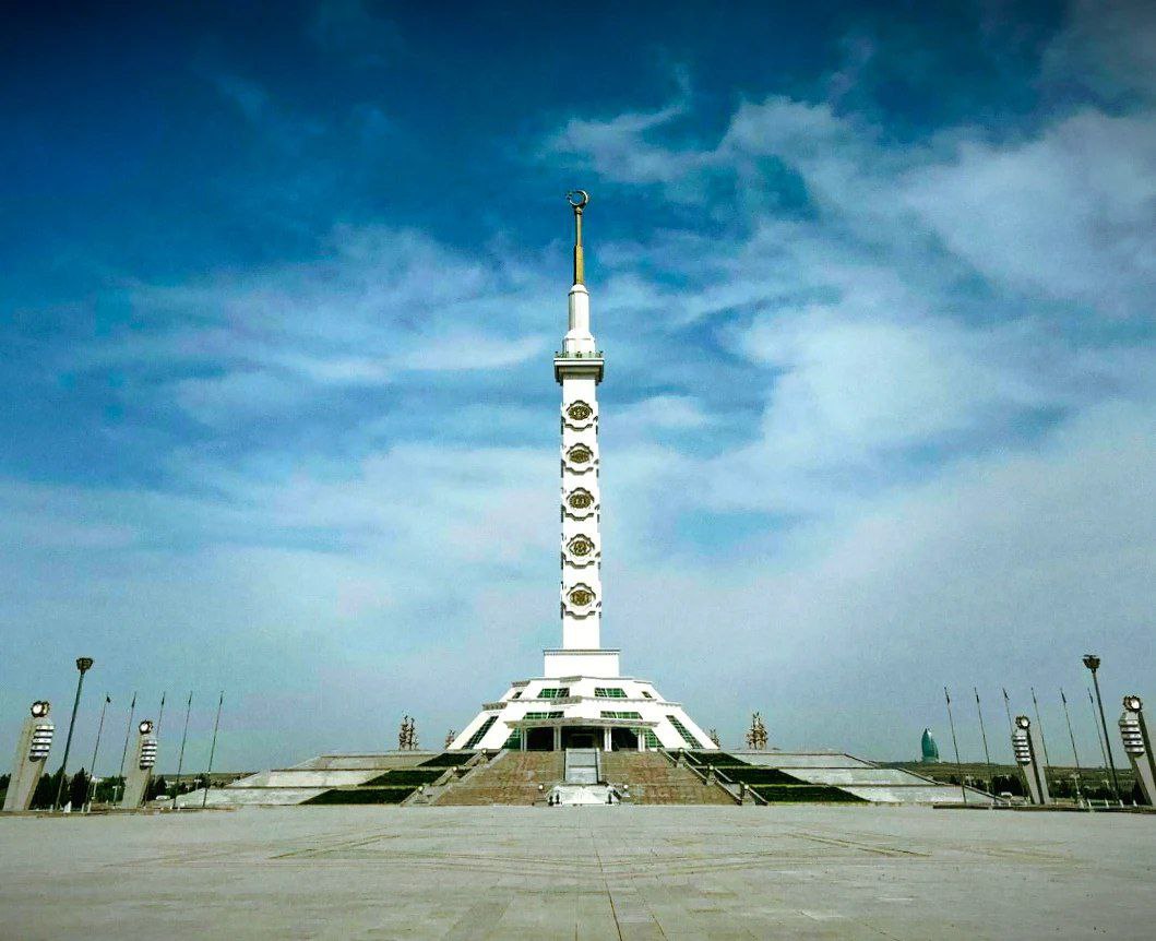 Его высота составляет 118 метров, а в основании заложен полусферический купол, по поверхности которого стекают воды фонтановГрозные статуи воинов у Монумента Независимости ТуркменистанаГород с одной стороны ограждает невысокий горный хребет Копетдаг