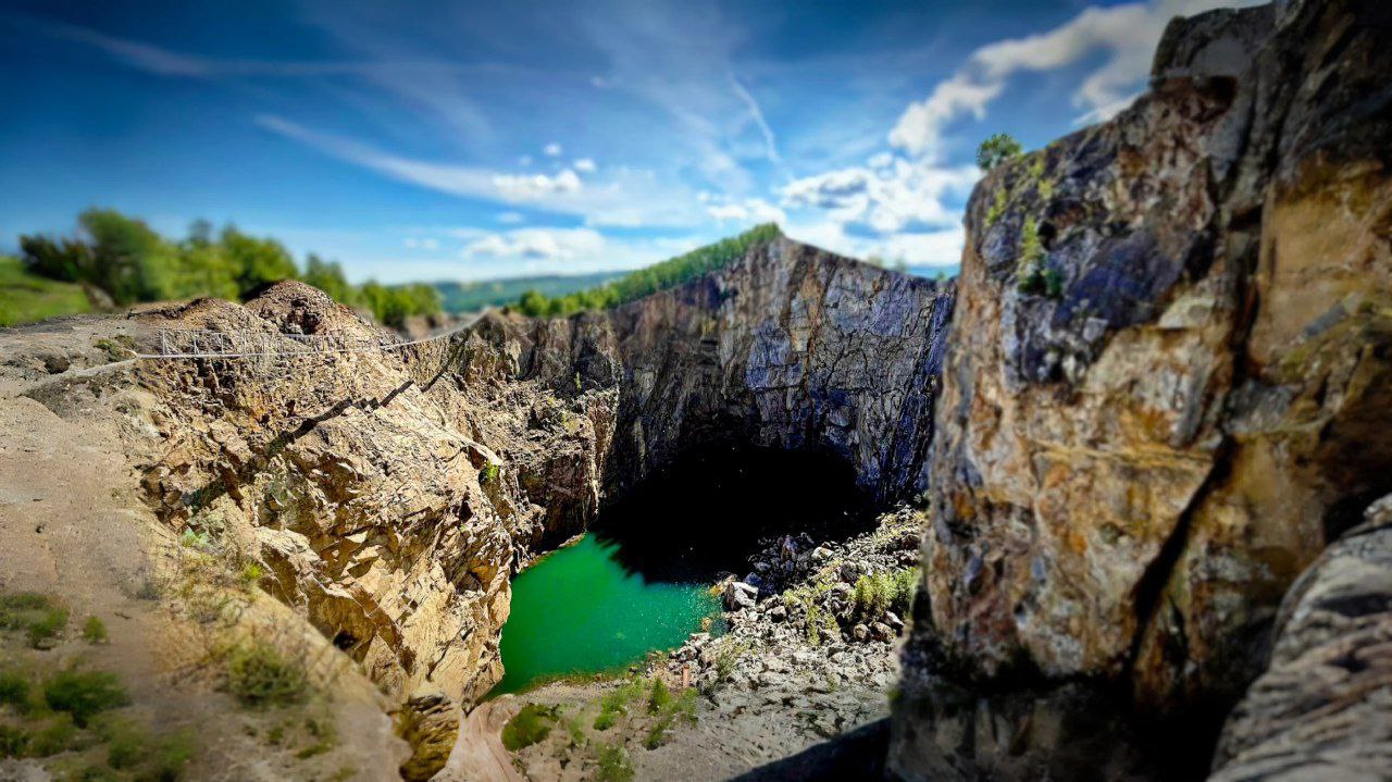 На месте бывшего подземного рудника образовался гигантский каменный каньон с отвесными стенами, на которых видны прожилки молибдена и меди, отливающие чёрным и зелёным.