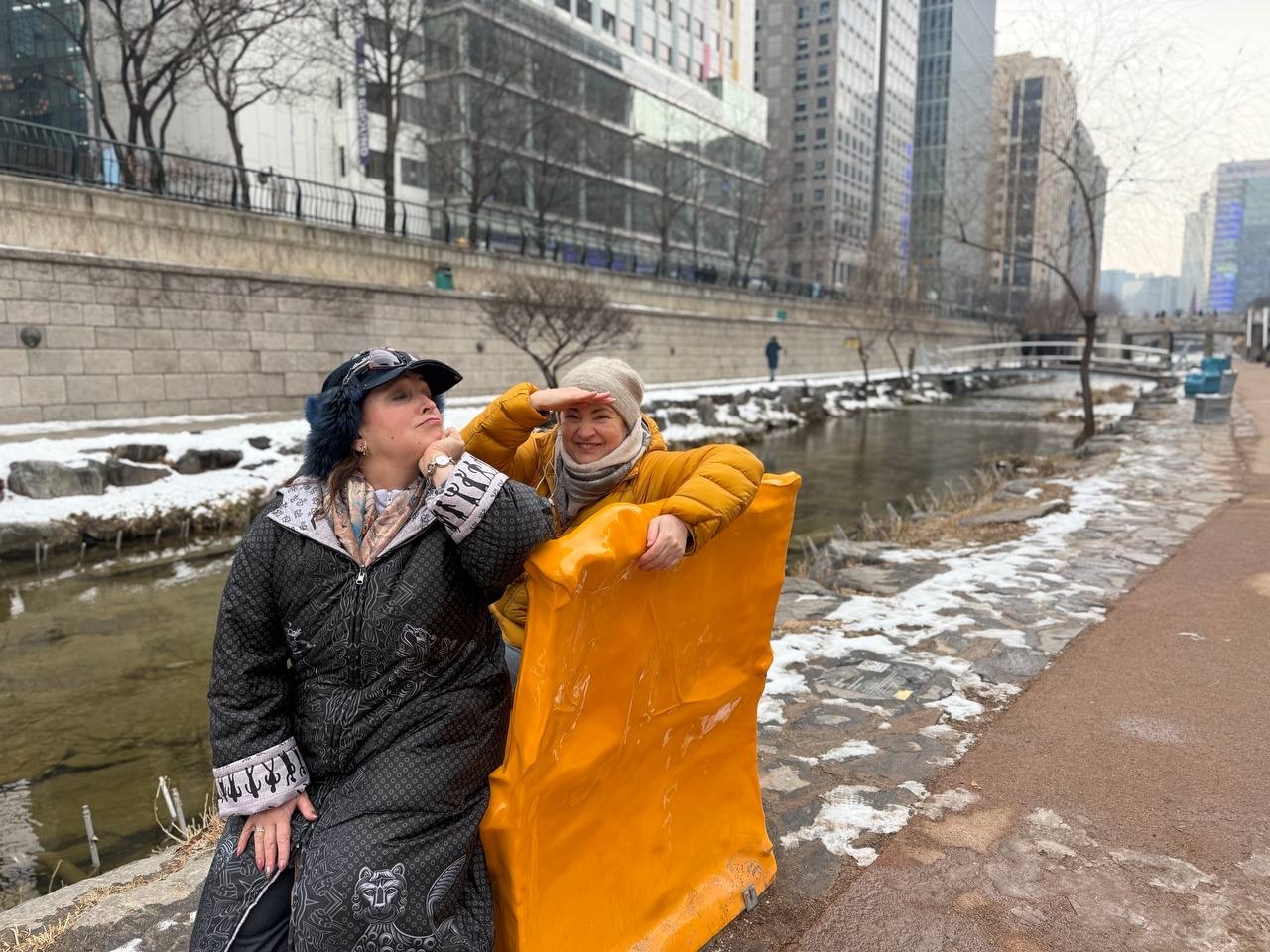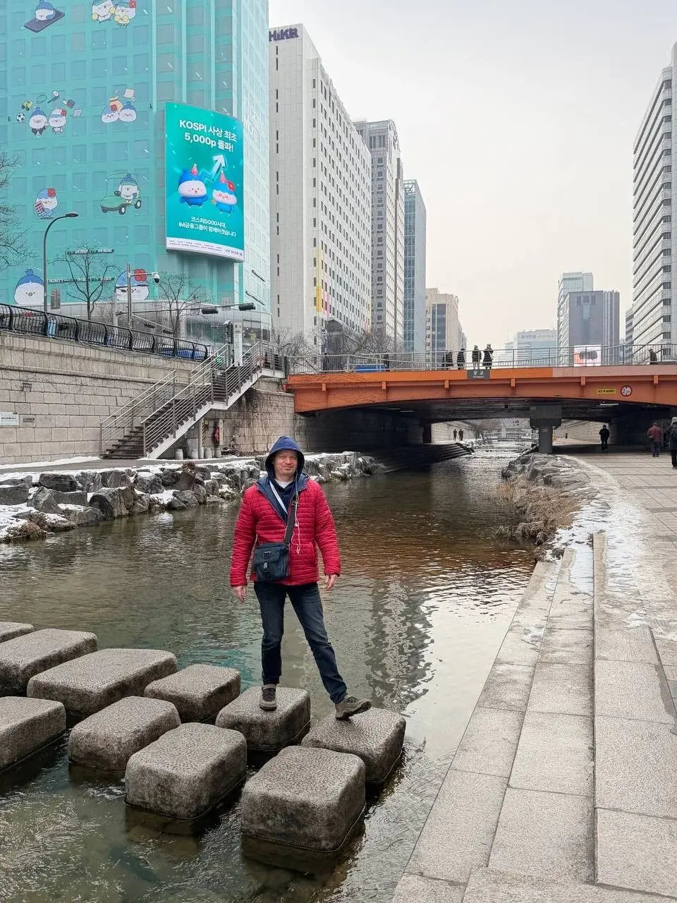 Идем вдоль ручья Чхонгечхон. Он то уходит под землю, то вырывается наружу прямо в центре. Идём, а навстречу — ЦАПЛЯ! Настоящая, стоит на одной ноге посреди города и даже не думает улетать. Цапля посмотрела на нас как на надоедливых экскурсантов.