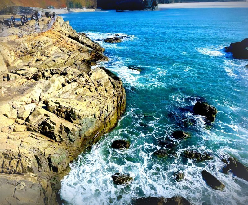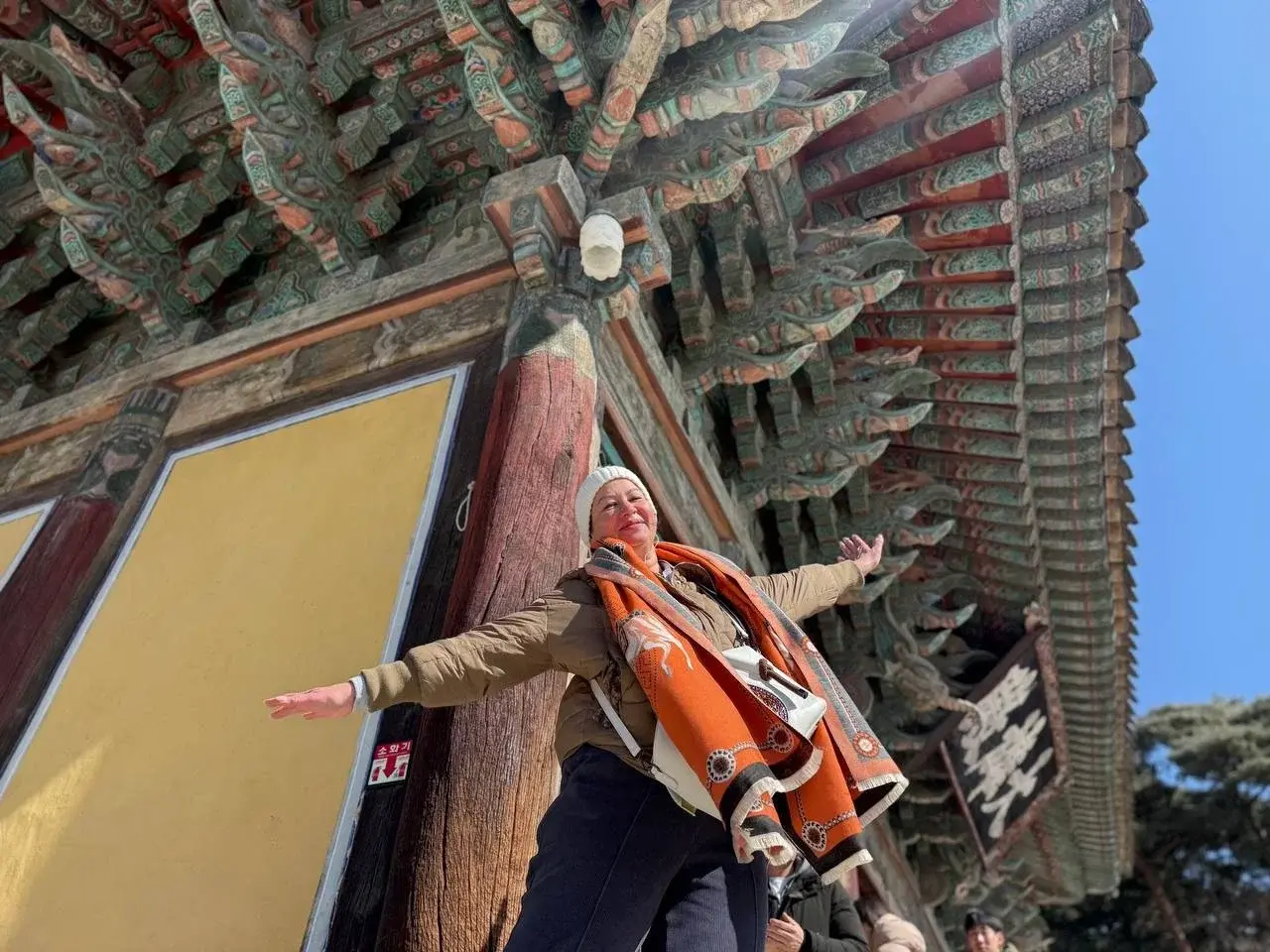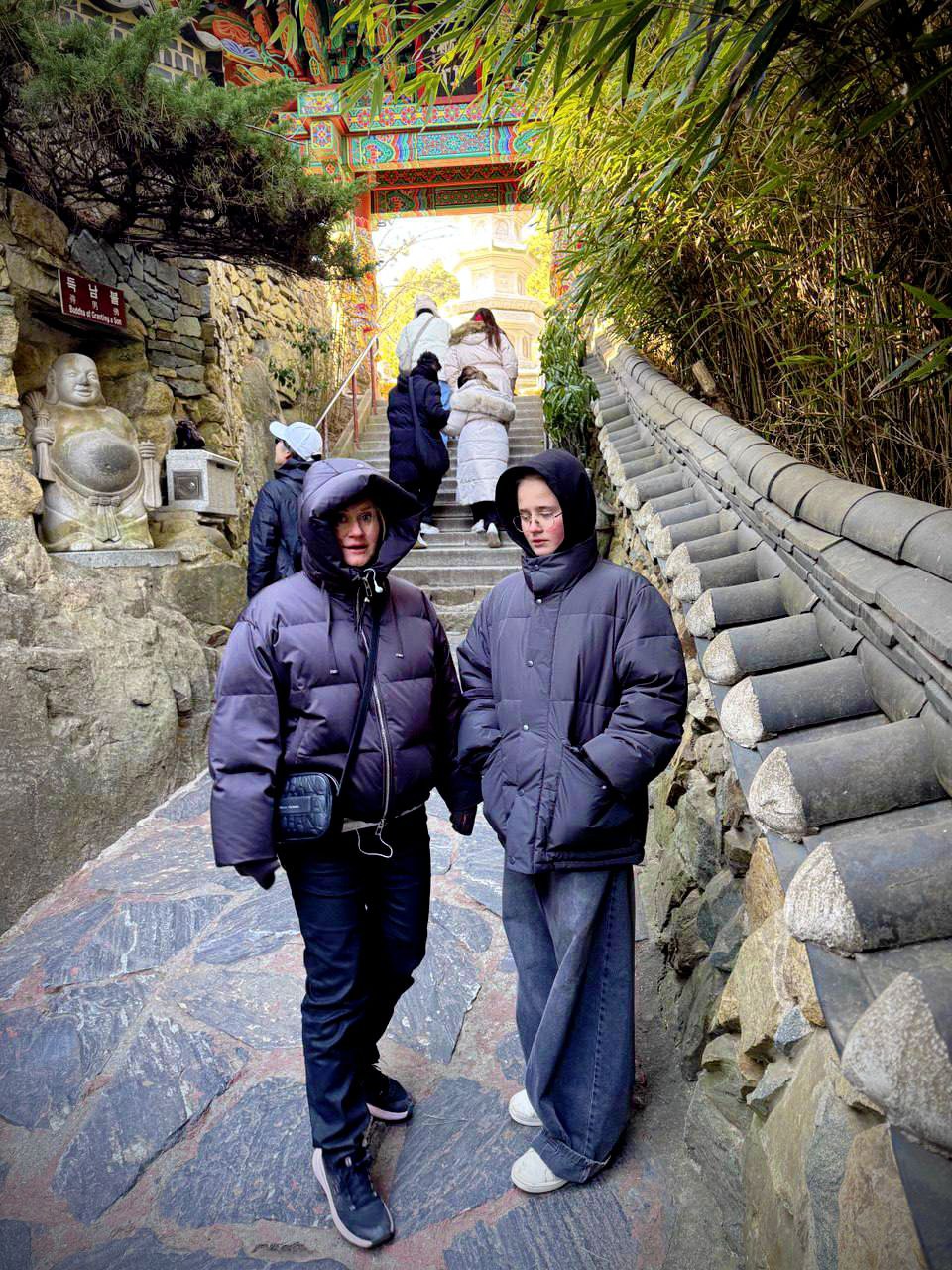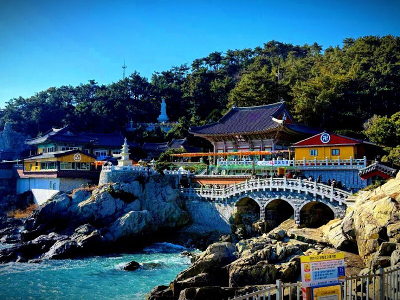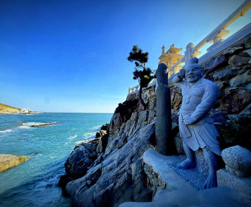 По программе был храм у моря. Я представляла что-то уютное, а приехали — волны прямо под стенами! Хэдон Ёнгунса стоит на скалах, ветер, чайки важные, не то что наши. Сразу дышать боязно — такая красота.