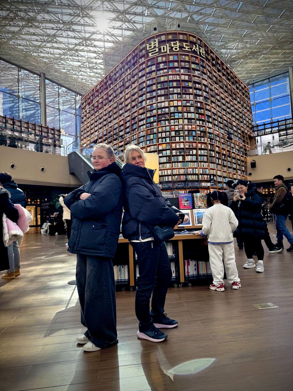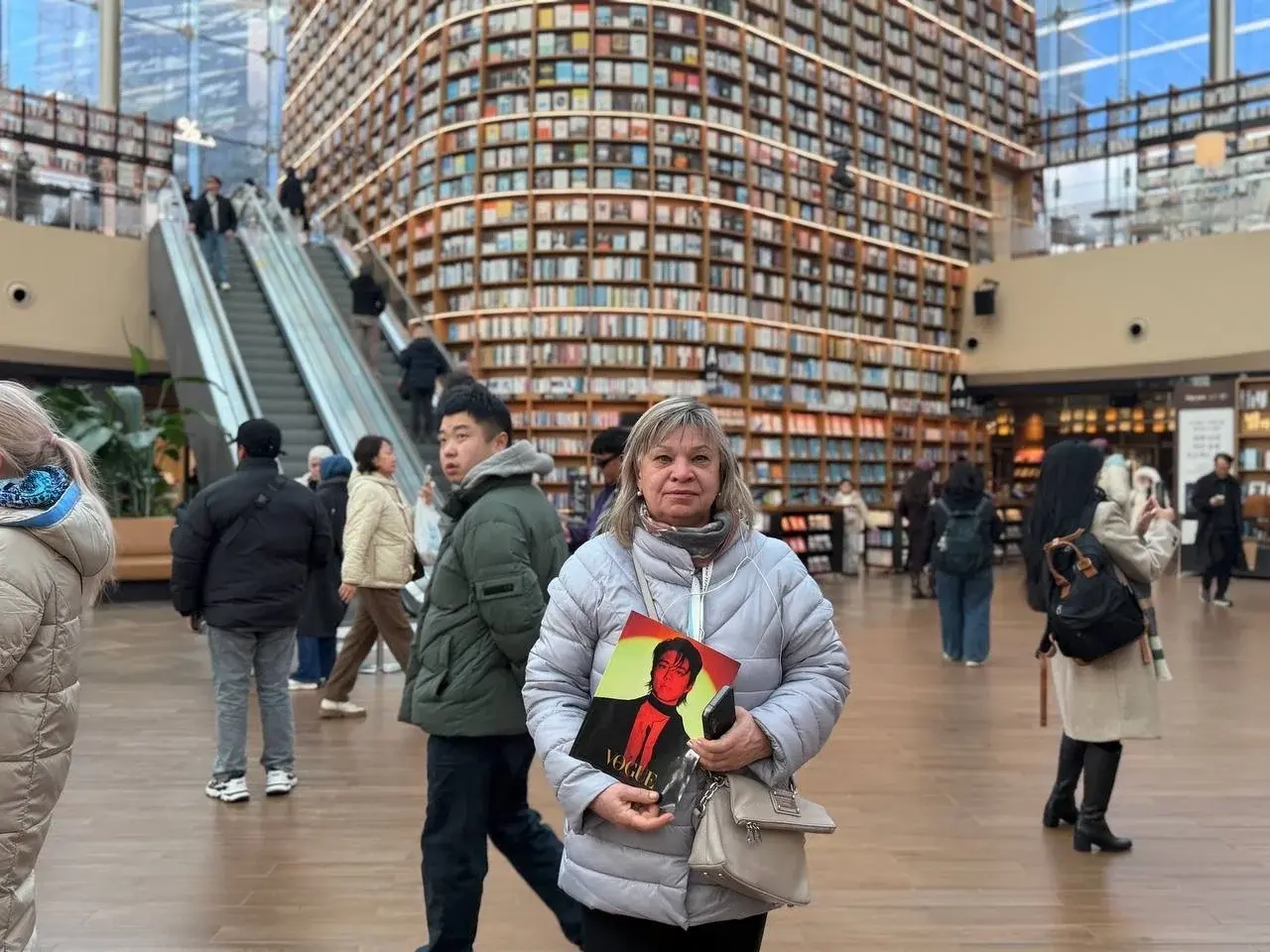 И напоследок — Starfield Library. Я читала про неё, но реальность… Входишь в обычный (ну, почти) торговый центр, поднимаешься на эскалаторе и просто замираешь.