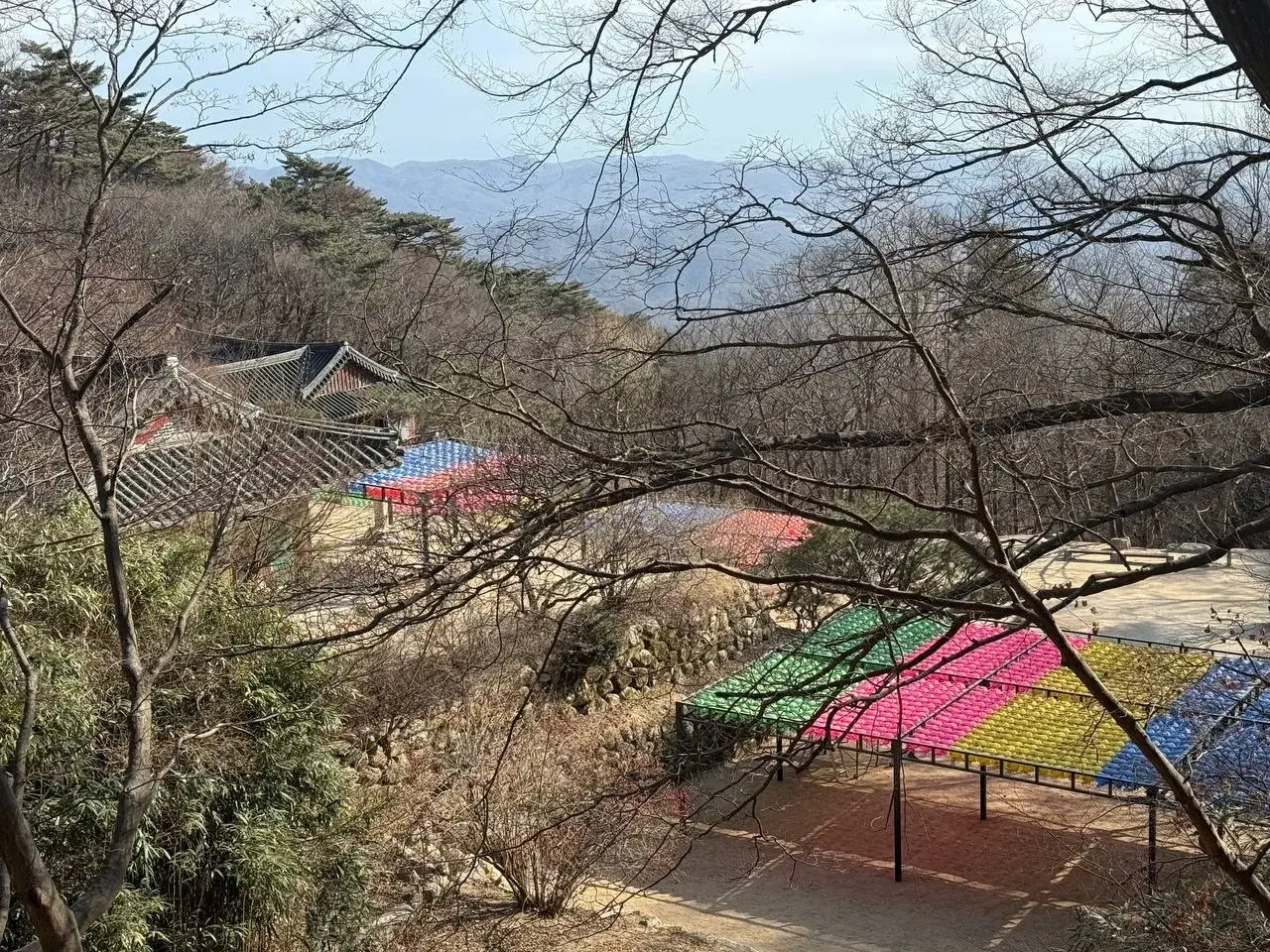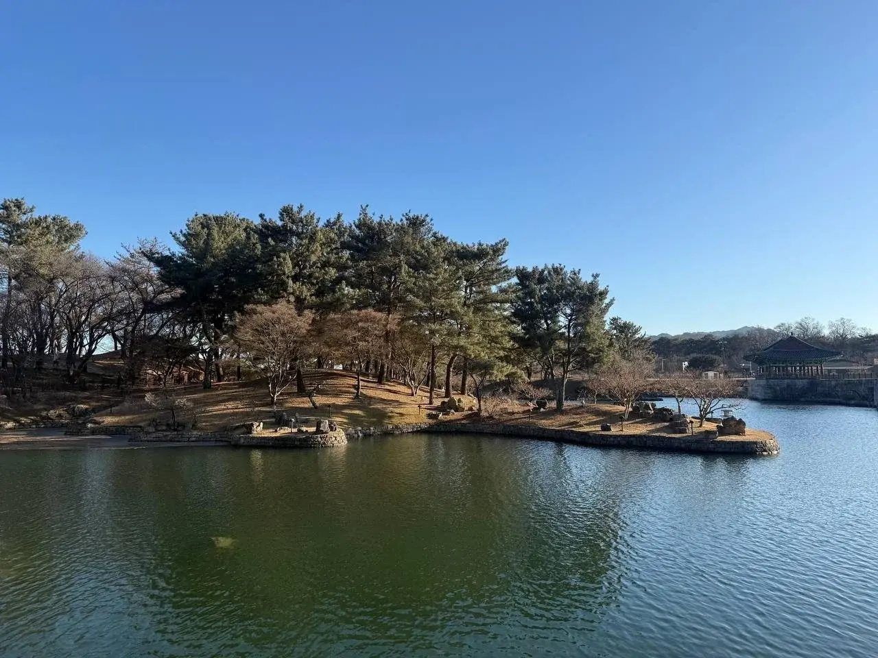 Храм построен у подножья горы Тохамсан. Вокруг все ухоженно, красиво, гармонично. Озеро, отражающее зеленый островок и мостик. Сосны, которые словно позируют на фоне гор. Традиционные черепичные крыши с загнутыми краями, которые будто всегда здесь были. Корейцы знают секрет, как вписать архитектуру в природу, не споря с ней.