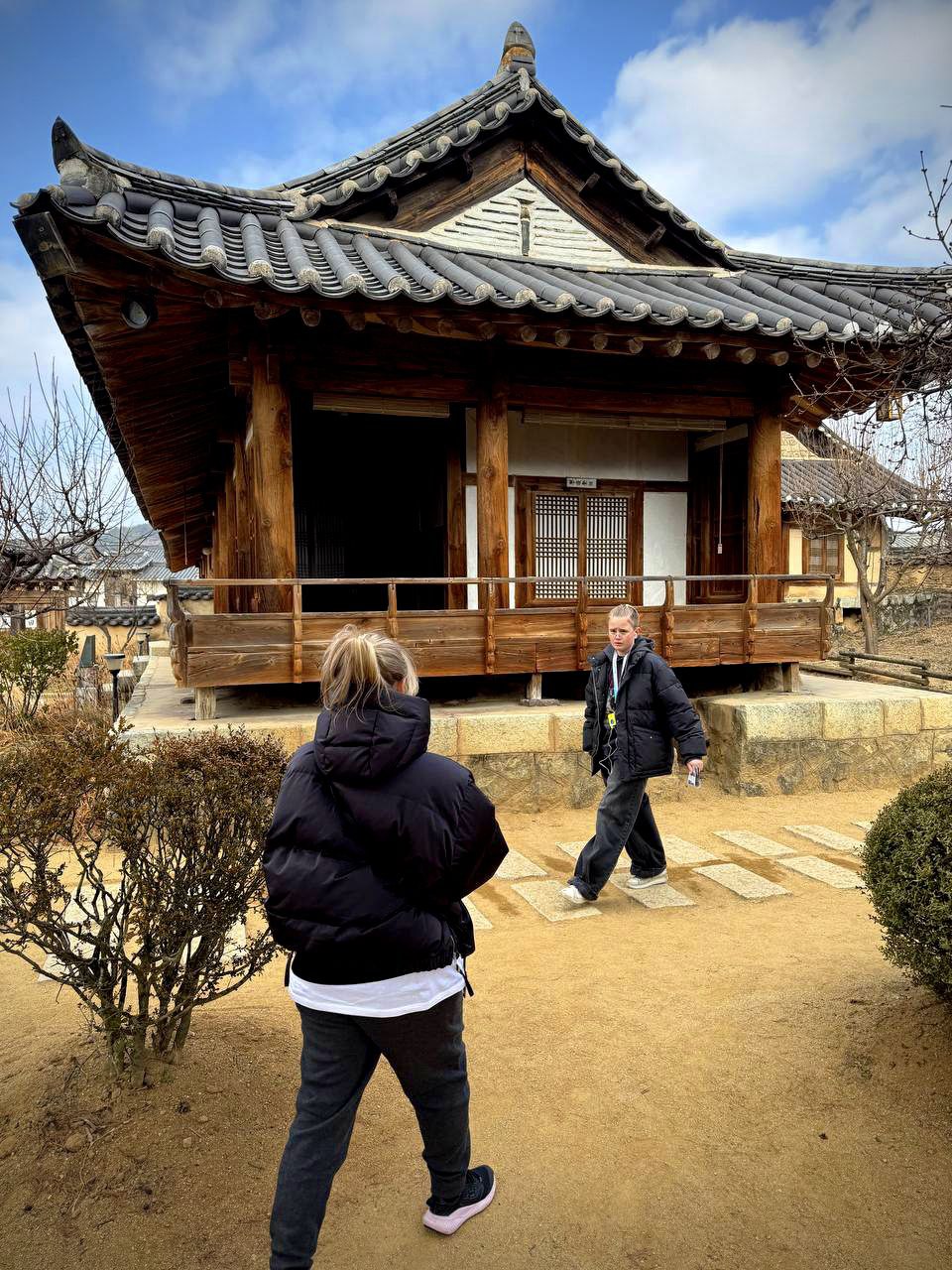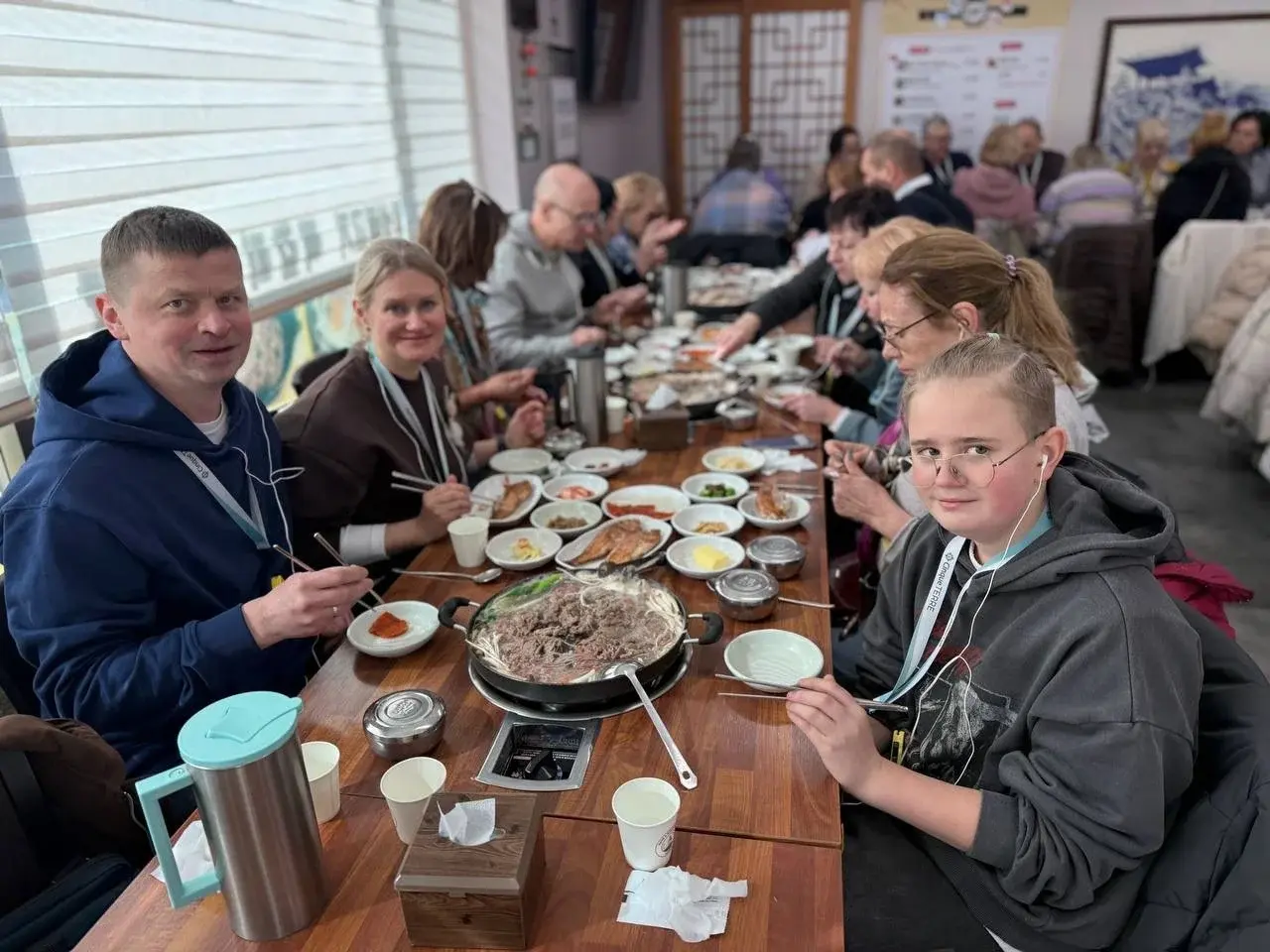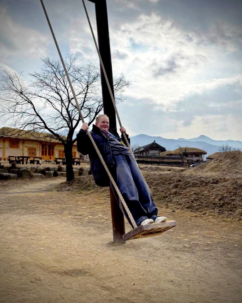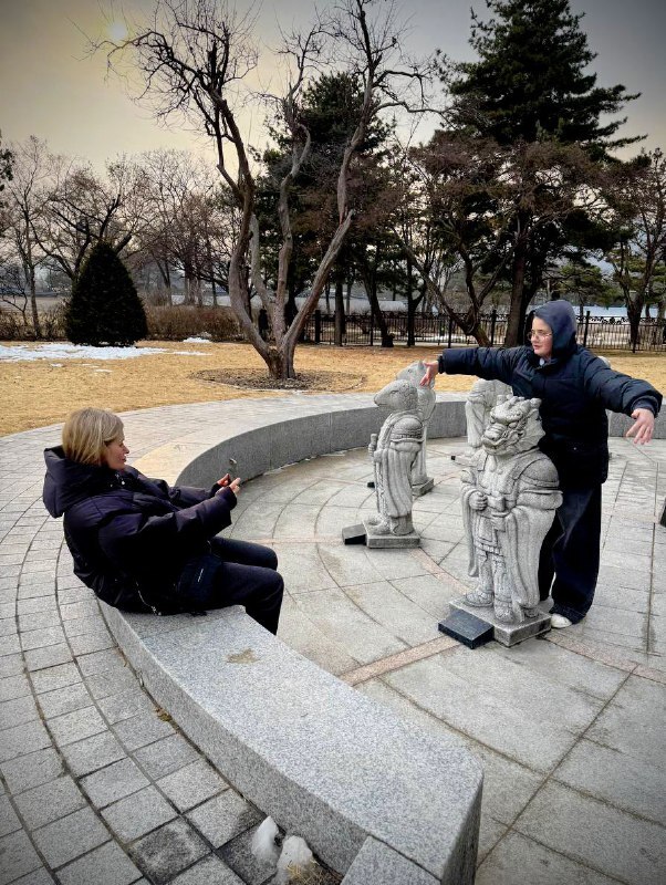 В этнографическом музее мы уже устали и хотели есть. Разглядываем макет корейской деревни — и вдруг группа школьников начинает нам радостно махать. Мы машем в ответ. Сын шепчет: «Это традиция?» А я думаю: просто радость. Открытая и тёплая, как весь этот город.