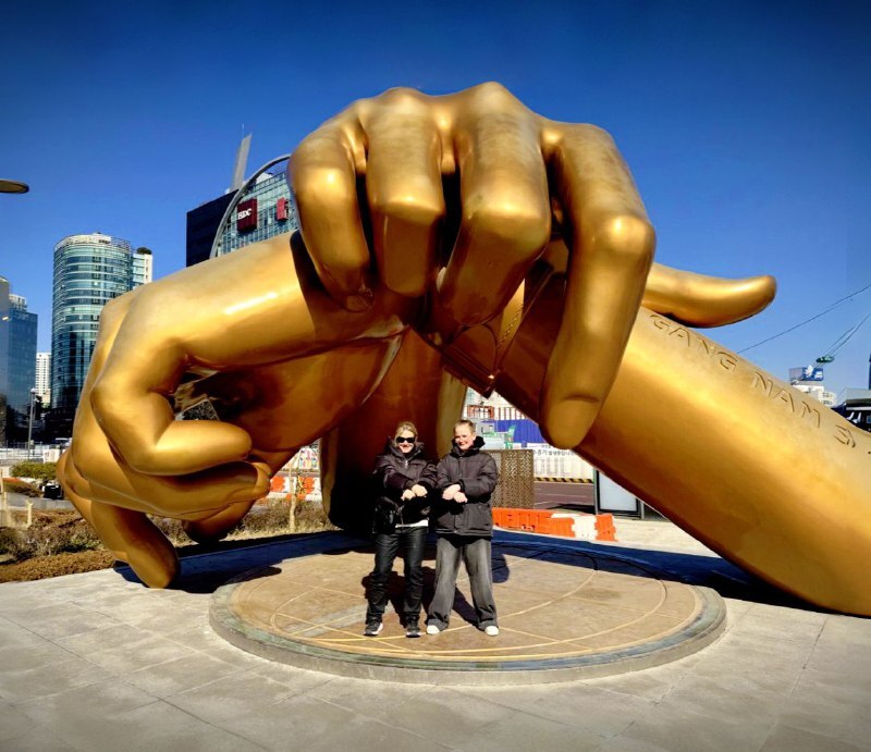 Потом отправились к статуи рук "Gangnam Style". Нашли, включили песню. И вот стоим посреди улицы, танцует, муж снимает — со стороны, наверное, умора. Но нам весело!