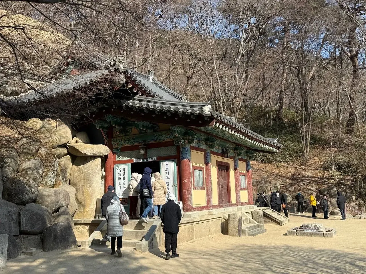 От храма по тропе можно подняться к наиболее узнаваемой достопримечательности Кореи - искусственному гроту Соккурам. Внутри - большая статуя Будды, сидящего в позе лотоса.