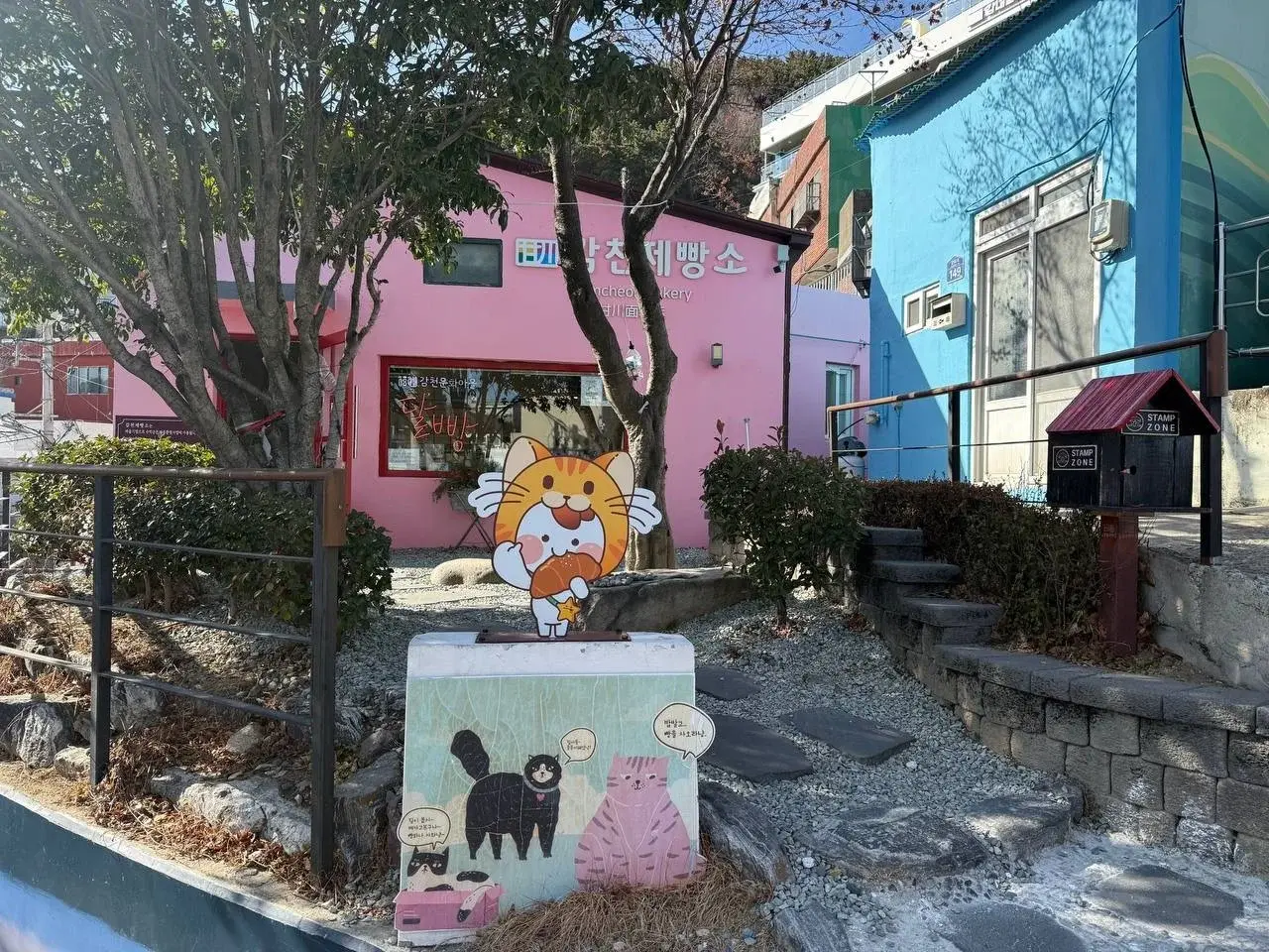 Дальше Камчхон. Я думала, ну домики покрасили. А приехали: мы попали в настоящий лабиринт из лесенок, цветных стен и котиков. Лезут по горе домики, как грибы.